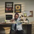 In spite of these issues, he appears passionate about his job, keeping a framed picture of a coworker on his wall and drinking out of a water cooler filled with coffee to work as much as possible. On one occasion he attempted to both multitask and fasten his work flow, creatively using two keyboards at once.