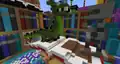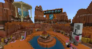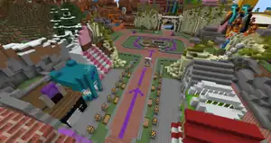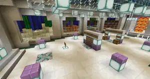 Dropping down onto purple wool, players follow an arrow to a sign welcoming them to the island, and then a map of the map. Surrounding this road are several buildings. On the right side are a Farmer's Market, Sports Shop, Bank, and on the left a Terracotta Art Gallery, Jewelry Store, and Bakery. The Farmer's Market is an open storefront with a red and white awning, and several melons, pumpkins, sponges, and red mushroom blocks on shelves. In a nearby pen are a pig, chicken, leatherworker and librarian. The Sports Shop contains a fireworks show, which can be activated by placing four blocks of redstone, while the bank holds many double chests full of gold ingots and emeralds locked behind a piston door, unlocked by two levers. The Terracotta Art Gallery is merely a collection of glazed terracotta displayed on walls, with a cleric behind a desk. The Jewelry Store is similar to the Sports Shop, but with the blocks going on the floor and triggering dispensers to shoot diamonds, emeralds, ender pearls and nether stars. The Bakery holds several cakes, with a sign lamenting that players don't have hunger in creative mode.