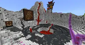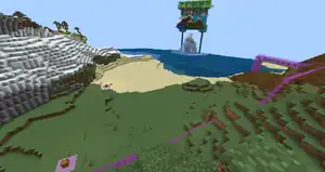 Surrounding the area are several tall, magenta buildings and a landscape of a mountain, with a visible cabin, pirate ship, and cave. Approaching the cave makes it apparent it's actually an enterable hole, and inside the player discovers the landscape is seemingly intended to be cardboard. Following the redstone lamp lines leads to the secret lever, inside of the area's logo.