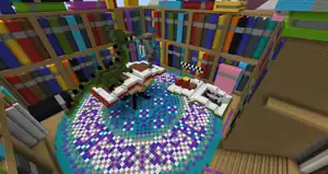 To the left are several chests containing colored blocks, right of that a chest with filled maps of the area, and then an armor stand holding a map in front of an item frame to help keep track of progress. Behind the supplies is a large tower shaped like a pencil, which can be climbed. At the top is an observatory with extra maps, and a sign instructing players to take a picture of the view. A second pencil is not far away, and between both is an entrance to Story Time, in the shape of gate resembling a library with a giant book logo. To the right are a build of a palette made of stripped birch wood, with shulker boxes hidden amongst the paint, containing further supplies for building and signs explaining how they function.