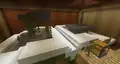The surrounding area is large and empty, with scant machines for the player to experiment with. Behind the chest is a command block, which can teleport the player to any of four rooms: the Stone Room, the Red Room, the Black Room, and Green Room. The player is encouraged to teleport to these rooms by inputting the coordinates, but they can also be found by exploring the wider area made of endstone, accessed from a shaft that can have a ladder enabled or disabled by a command.