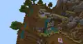 Returning to the front is a beach, with a chest intended for the "Sandcastle Building Area," including blocks like sand, sandstone, acacia, and banners. Nearby are two more chests, one on a frozen ocean microbiome with ice and snow for building igloos, and another in the waters, surrounded by sea pickles and intended for building a coral reef. The secret lever can be found easily, by simply following the lightline up to the logo, perched on an iceberg.