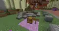Beyond that is a small grove, surrounded by redstone lamps encased in stained glass, containing demonstrations of a garden and home, with accompanying chests containing supplies to complete them. On the lamps are signs, telling the player to locate the "five secrets" of the island to light them up, but also warn that "[the player] might want to lower [their] music as well...". Surrounding the entrances to the areas are several more miniature building opportunities. Between Mirror and Terra Form is a pond, meant to be filled with squids, while between Story Time and Mirror is a spruce fence meant to be filled with chickens hatched from thrown eggs.