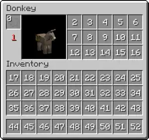 The GUI that appears when interacting with a tamed donkey or mule, or when opening the player's inventory while riding a tamed donkey or mule.