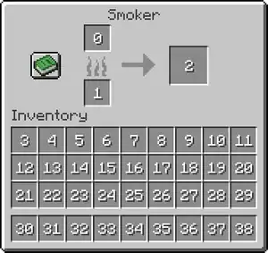 Same layout as a furnace; however, the recipe book displays smoker recipes instead of regular furnace recipes.