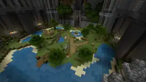 When creating a new tutorial world, the player will always spawn in this enclosed area. They are given tutorial pop-ups that can be skipped or progressed through. There is a partially built house, made of oak planks. At the back, there is a tunnel with stairs that appears to be caved in. Towards the front, there is a broken bridge that, when either rebuilt or traversed around, leads to a room with a bridge suspended over water, with creeper faces made of dark prismarine on either side. The bridge leads to a stairway that brings the player out into the main tutorial area, greeted by a giant stone Minecraft logo above head.