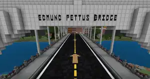 Outside the bus, the road takes a left, with many activists standing on both sides of the sidewalk. An NPC, named Civil Rights Activist, explains that John Lewis led the first of three Selma to Montgomery marches. Following a series of glowstone arrows, the player crosses over Edmund Pettus Bridge, as protestors begin to slowly appear. At the end of the path is a green beacon, before a series of police officers and guard dogs. Instead of John Lewis, at the end of the path is his younger self, explaining more about the protests and the abuse he suffered by the police. After walking past the blockades, John Lewis as he appears elsewhere in the map returns, and explains they must now travel even further back in time.