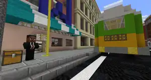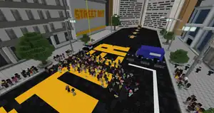 Near the largest crowd in the area, so large that there are police NPCs present, John Lewis explains the origins of Black Lives Matter, crediting Alicia Garza, Patrisse Cullors and Ayọ Tometi. From there, the protest will culminate in a police blockade, with two vehicles in tow. Beyond those, John Lewis offers an activity, teaching the player about the significance of street art, such as graffiti. Using a spot on the city block, he enables the player to build their own street art, in the form of a chest containing all colors of concrete, three diamond pickaxes, and red, orange, yellow, lime, light blue, blue, magenta, and pink stained glass. The blocks can only be placed inside of a 10x44 grid, marked by smooth stone and iron bars.
