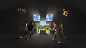 The event is an hour long, interactive, in-person adventure where participants in groups of 25 go through a mission and scavenger hunt through multiple Minecraft biomes and dimensions to rescue villagers. Mobs such as skeletons and creepers can be encountered, ore can be mined, and ingredients can be foraged.[1] Guests must cure as many villagers as possible using the ingredients they collect in the 7 rooms.[4] The world is created using displays in tall projection walls and floors which can be interacted with using orbs of interaction and motion detection.[5]