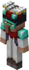 A white-robed villager wearing an enchanting table on their head, with diamond shoulder pads and goggles, and an obsidian colored fanny pack on the back. | White robed villagers would be removed in Village and Pillage. |