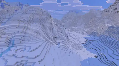 The frozen peaks are covered by snow, snow blocks, with glaciers of packed ice and occasional small blobs of ice. Packed ice cliffs can generate in steep sides to the east or north with only a layer of snow covering them. Because this biome generates in positive weirdness, this biome usually generates in smaller and smoother hills, but it can also generate on taller and more jagged and pointy peaks but less compared to the jagged peaks biome. Frozen peaks generate in temperate, cold, and snowy biome temperature ranges. Frozen peaks generate in positive weirdness, meaning they can border meadows but not cherry groves.