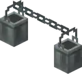 Buck-chuckets are two buckets conjoined together by a chain. The individual buckets look broadly close to the shape of a bucket; however, they are made of a solid gray metal and extended into a voxelated shape, with added handles. The chains are similarly faithful, with the edges being slightly rounded.