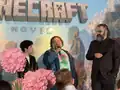 The step and repeat banner had featured an Overworld backdrop with a bee and the movie's logo at the center top. Around where the person stands are life-sized models of the pink sheep and creeper from the movie which were surrounded by grass blocks and cubic plants.