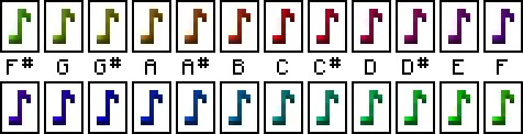 The exact pitch to use-count assignment is shown below,[1][2] along with the note's color, which is rendered with shading using the particle's texture.