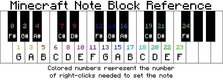 Excluding mob heads, there are 16 different instruments and 25 different pitches per instrument (a total of 400 notes with different sounds). Using a note block increases the instrument's pitch up a semitone, with a total of two full octaves (24 semitones in total) being available for each instrument. The standard range (for harp and pling instruments) of notes span from F♯3 to F♯5. After reaching the highest note (24 presses of the use button), pressing use again (25th press of the use button) resets the pitch back to F♯3, as does breaking the block. The note block's pitch is ignored for player heads and the six mob heads.