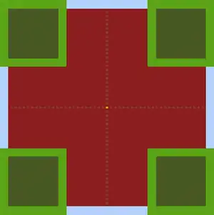 A visual representation of patrols' spawning conditions. Captains can spawn on dark green blocks and the "support" pillagers can spawn on any green blocks.
