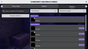 In the Story Feed, all story posts from Realm members are shown on the right side of the screen, and a list of recently played members on the left side. A player can add with the purple button on the top-left. A story post can contain text, and/or a screenshot that is stored in-game.