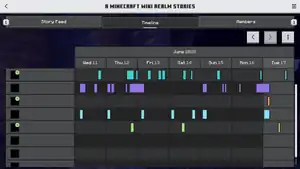 Realm Stories also contain a Timeline table that shows numerous activity of players in the Realm. The playing times are colored for each player. One week of playing times is shown on the screen, but older data can be viewed with the arrow buttons above. To gain access to the Timeline and store activity data, a player needs to opt in for the Timeline. Players can opt out at any time, and they can also opt in anytime later again. The Realm's owner can view all members that are opted out.
