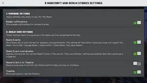 | Realm Events | Allow Minecraft to post stories for gameplay accomplishments. This setting will take effect once you close and reopen the Realm. (Go to "Edit" → "Manage Realm" → "Subscription" → "Close Realm" → "Open Realm") | |