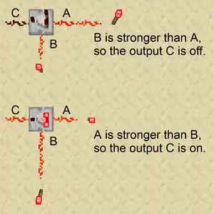 It can also be set to either stop outputting a signal while its side input is receiving a stronger one (front torch off), or output a weaker signal based on its side input's signal strength (front torch on).