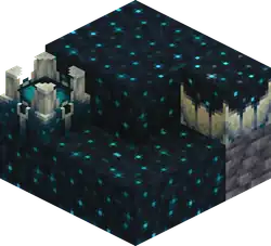 Sculk Shrieker, a block that "shrieks" if a player stands on it or triggers a nearby sculk sensor. This shrieking may cause the emergence of a warden, if the sculk shrieker in question was created at world generation. Drops 5 experience.