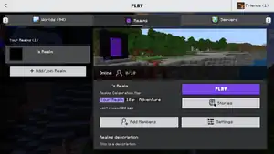 This tab lists all Realms by name along with the world. The main page of each Realm shows the amount of online players as well as information about the activated world and the Realm. When the player does not have access to a Realms server, this screen shows information about a Minecraft Realms subscription as well as the option to subscribe.