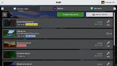 This tab lists all worlds by name along with the game mode of the world, the date when the world was last played and the world's file size. Worlds set visible to LAN players in the same local network also appear on this screen. Up to 12 worlds are shown per page.