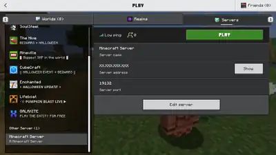 The server list essentially functions the same as Java Edition counterpart, except it has a separate section where players can join featured servers that have partnered with Mojang Studios.