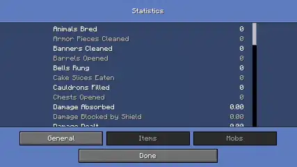 | Pre-Release 2 | Added following statistics: Bells Rung, Interactions with Cartography Table, Interactions with Loom, Interactions with Stonecutter, Raids Triggered, and Raids Won. | ||||||