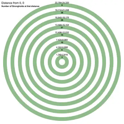 - The third ring has 10 strongholds within 7,424–8,960 blocks of the origin.