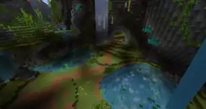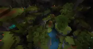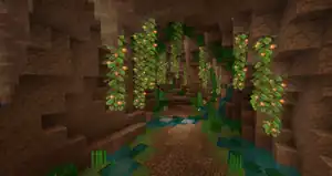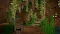 As the ancient door unlocks, the player will be brought into another cave, this time centered around platforming and following several soul torches. Players will need to cross several platforms with moss on top, before traversing a collection of cobbled deepslate stairs and jumping over a pit; if they miss this jump, they can climb back up using two separate pairs of vines, one leading to a platform between the main path and a golden pot. At the top of this route, Aisling will instruct the player to climb many more vines to reach a higher level, initially consisting of several tunnels of moss floors before coming to another, more forgiving pit. From there the player will leap across more, smaller platforms, before reaching two branching paths. To the right, will be another ancient door, again marked by a torchflower, and to the left another deepslate staircase that leads to another golden pot and two spruce support beams the player can jump over. Finally, the player will discover a lever made out of tuff, which will unlock the door. Upon opening it, Aisling will praise the player's dreams as "some of the most exciting I've joined."