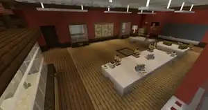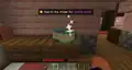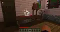 To the right is another display case, labeled the same as on the left, but in front of that is a table made of quartz stairs, holding two microscopes (made to resemble spyglasses and a sample of sand with a magnifying glass. A similar table is right behind the player's initial spawn, containing several more of the jar and microscopes, as well as small test tube with pencil and paper. Sandwiched between both is a third table, holding two green rolled blankets and 3D leaning shovels. On the right wall, the player can find a desk containing a cartography table and lamp consisting of an end rod and quartz pillar, behind that a collection of beehives symbolizing filing cabinets, and the Bust and Albanian paintings. On the left side of the right wall is a chalkboard, made up of gray concrete powder, smooth stone slabs, a white candle, and polished blackstone button. In the corner is another lamp, made up of an end rod and skull, next to a lectern.