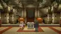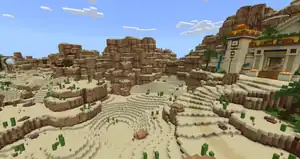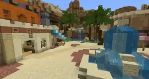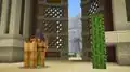 From there the player will have to climb a large dune, before finally arriving at the temple. In order to enter, the player will need to climb a series of vines, with the camel being expected to be left behind. Upon entering, Aisling will call the temple breathtaking, and suggest the player look for something to open a large, locked door. In order to do this, the player will have to search out several buttons, the closest to the entrance being behind a pole, with fireflies marking the spot. Upon clicking any button, a counter will pop up, teaching the player there are seven in total. The second closest is underneath the entrance and accessed through a flight of birch stairs, which activates a trap, summoning uniquely designed husks and silverfish colored like sandstone. Returning back to the first button, the player can go another path into a dark hallway and follow torches until they find the third, releasing several silverfish from the ceiling. The fourth button is out in the open, built into a pillar right outside the silverfish trap, the fifth being on the opposite side of the chamber high on another pillar, and the sixth being the same but closer to the door. The final button is again close by, hidden underneath a staircase by a brazier with a hole full of sand.