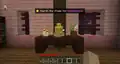 The player is immediately dropped into the center of a large room, resembling an office or classroom. In front of the player is a bulletin board, with a persuasive help wanted poster. Clicking on that starts the map proper, but the surrounding area can be explored in full. To the left is an empty display case, labeled My Discoveries, and next to that is a large bookshelf with a dark oak log frame and replica of a potted plant, with azalea leaves and a spruce fence trunk. Between those is a non-interactive door, made up of stripped dark oak logs and a polished blackstone button. Next to all of those is a replica of a desert pyramid, labeled as the Desert Temple, in a jungle wood display case with two wooden buttons.