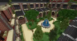 The back walls are a collection of windows, the right side partly opened, represented by iron trapdoors. Past a garden of azure bluets, the player can see a vast university, with several trees, a fountain, azalea leaf vines, lantern fixtures, and identical windows to the ones being used.