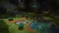 Opening the door will lead into another chamber, this one above a large water system. Heading up more stairs, the player will find an empty pad on the floor, Aisling proposing a square object goes inside. Platforming across several pillars made of birch planks to the left of the room, passing a statue of a humanoid figure, the player will find this object, which can be moved by punching and will cause a staircase to lead out of the temple to appear. From there the player will need to repeat this process, now looking for three objects to activate another door. The first, recognizable as orange, will be to the right of the entrance, leading into a small room where the object will need to be carried over several bridges made of jungle planks until the player falls down a pit, right beside the pad outside. The second, yellow object will be right out in the open, to the left of the entrance, but not immediately reachable. Heading down into a hallway will lead to a ravine, leading into a platforming section accessed from swimming up a water stream to the right. Two other will be present, but will lead to nowhere. Once the player clears the short platforming, they will obtain the key, and can be escorted to the middle of the area. The final, purple object is above the door, and can be found by returning to the right path and leaping onto the top of the door. Once the player reaches it, it can be quickly dropped onto the pad, opening the door.