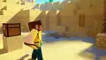 Ari is then shown brushing suspicious sand and almost excavating a skull pottery sherd, but a horde of monsters emerge from the sand from behind. As Ari runs away, Alex emerges along with them and runs off to their camel. Luckily for Ari, the monsters burn in daylight. In a cherry grove, Zuri has hatched a number of sniffers, and is busy working on a house. Alex then arrives and is greeted by Zuri from the roof of the build, while a calf and snifflet become acquainted. Hard cut to Steve on a cliff in a storm, almost falling off as a creeper creeps behind them. As Steve is creeped out and inches closer to the edge, the creeper becomes charged. In the nick of time, Alex arrives riding the camel, and saves them by dashing off the cliff. Safe and sound, Steve and Alex return to the beach where Steve was based, petting the camel calf. Meanwhile, Ari returns to a desert base with the sherd and crafts a pot, Zuri hangs a hanging sign, and Alex places a skull on a note block.