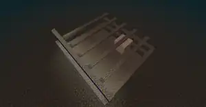 Once the rails are run all the way from the world spawn to the build site, double check that there are no gaps anywhere in the rail line from the world spawn all the way up to the contraption's drop shaft. Then break the most recently used bed, make sure you're not wearing any armor with Thorns, optionally grab a shield, and head into the End to find an End city with two shulkers still at the entrance. The city should be as close to an End gateway as possible, though exact distance is less important than how much bridging you'll need to do between the two. Again, Chunkbase can be used to find a suitable candidate. Enter through the opposite side from the entrance to prevent the shulkers from seeing you and place blocks as shown below to obscure the shulkers' vision and set up the rails which will eventually be used to pick up the shulker.