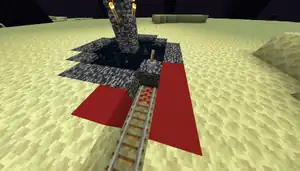 Once that's done, place regular rails leading all the way up and into the End gateway. Take note of the direction your rails are facing using the F3 debug screen, then go through the gateway. A trapdoor or fence gate can be used to force you into the 1-block-tall swimming position to go through without using an ender pearl each time. Depending on the type of gateway, you'll either end up at a corresponding gateway on the main island or on the obsidian platform at 100,49,0. If you arrive at the obsidian platform, just remember that any blocks on and above it will be reset to air anytime an entity enters the End, so if you exit and re-enter the End after building here (or if anyone else enters the End if you're on a server) before you get the shulker, you'll need to replace the rails. Wherever you arrive, place rails under yourself in the same direction as before and continue placing rails up to the corner of the exit portal, with an activator rail at the end, powered by a lever. The activator rail will try to eject the shulker into one of the up-to-8 adjacent air blocks at its Y level, so make sure that there are solid blocks in the spaces around the activator rail so that the only available spot is inside the exit portal.