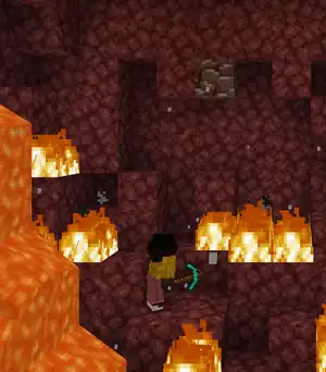Using a diamond pickaxe with at least Efficiency II, the player can instantly mine the netherrack. With the proper angle, this makes it possible to mine while maintaining sprint. The player can then go in one direction until they hit lava, and proceed to mine in another direction. However, it is highly recommended to have multiple potions of Fire Resistance, as it is possible for the player to accidentally run directly into lava. Compared to using beds or TNT, traditional mining is resource-efficient, as only tools and food are strictly needed. This method allows you to mine about 12 blocks per second.