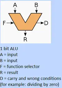 The ALU shown below is a 1-bit ALU with the functions: ADD, AND, XOR. It takes the A and B inputs and then performs the selected functions. Read about the adders to see how the ADD function works. XOR and AND are basic functions that are explained on the logic circuits page. There can be more functions added to an ALU, like multiplication, division, OR, NAND... etc. These functions could, with some modifications, be added to this 1 bit ALU.
