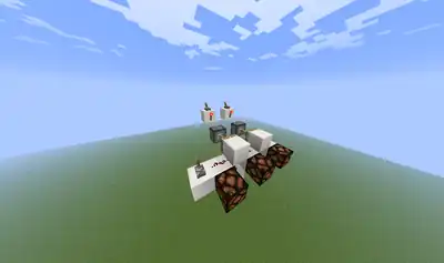 This is another example of a simplified version using Gray codes. The output appears at the torches at the end of the top rows. This design can be extended to any number of bits, but practical limitations due to timing considerations restrict the use of more than a byte or so. The outputs are triggered by the inputs 11, 01, 00, 10, respectively.