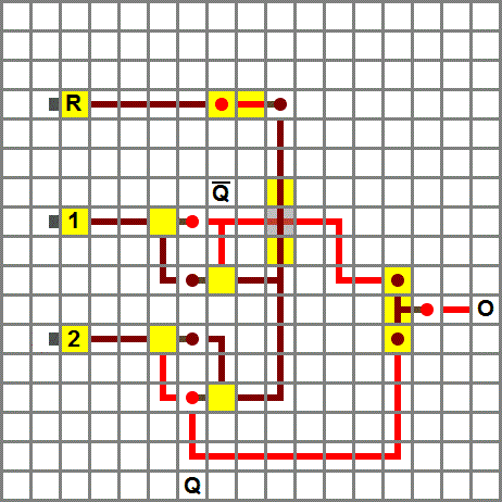 There is also another way to make order-sensitive combination locks. It is based on several RS NOR latches that is placed on a row. The RS NOR latches are connected together, and each latch is connected to one button. The combination lock opens when all the latches are activated. To activate all of them, the latches have to be activated in the right order. If wrong button is pressed, the lock automatically sends a reset signal to the first latch, and resets the entire lock. The circuit also has a T flip-flop that controls the output. The T flip-flop turns on and stays on when the right combination is pressed. When the lock is open, all the buttons works like a reset button. This makes it easy to close the door from the outside. Just press a random button. It is also possible to connect buttons that overrides the lock and makes the output signal toggle like on a normal T flip-flop.