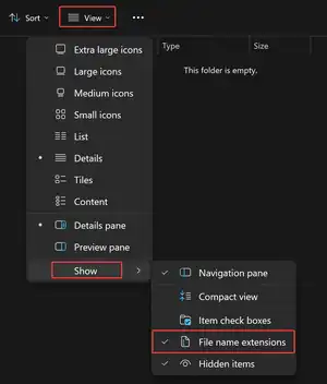 • For Windows 11, you can turn them on by opening the "View" dropdown menu in File Explorer, then hovering over the "Show" option, then turning on the "File name extensions" option.