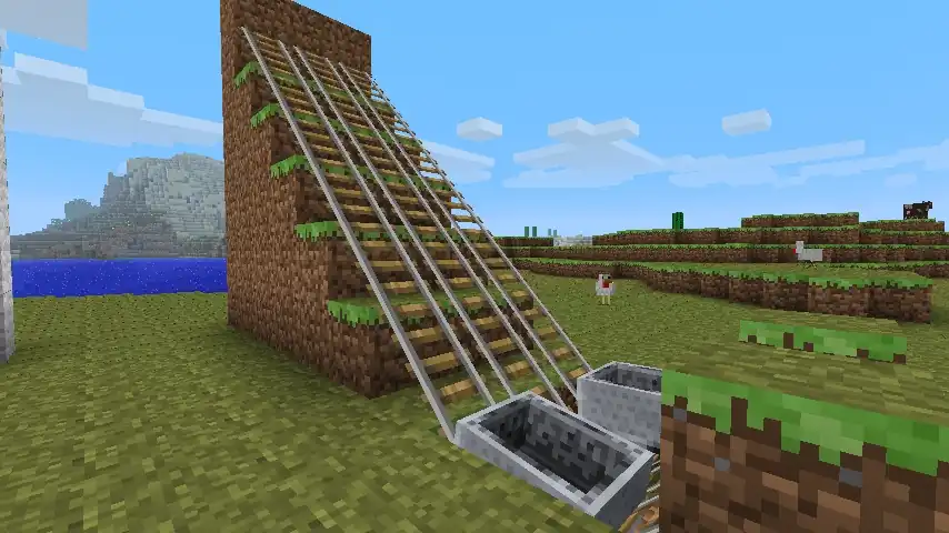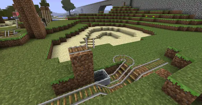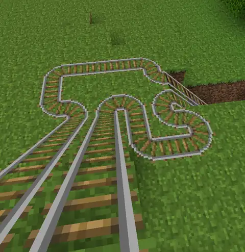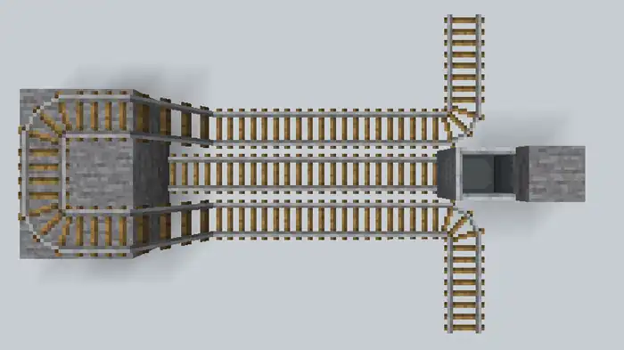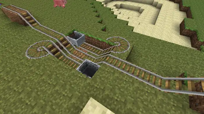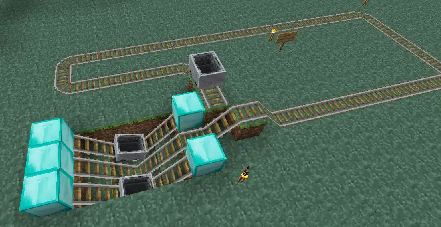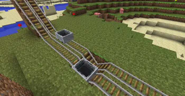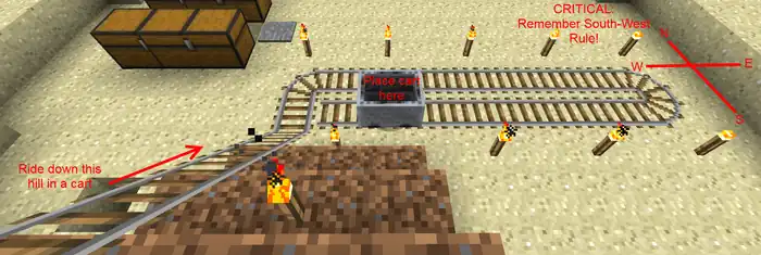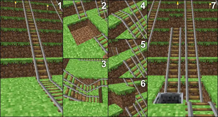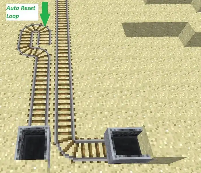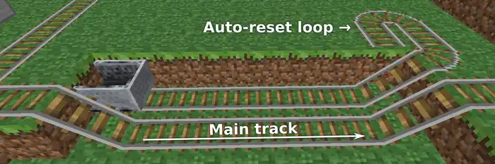 This booster uses a raised auto-reset loop, so that it can be built in any direction. The booster minecart will go through the loop and fall onto the inclined track, going back to the starting position.