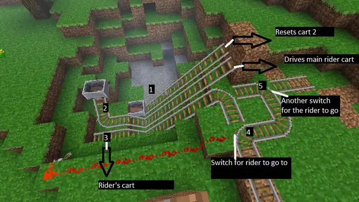 Cart 1 is a simple uphill booster used to force cart 2 back to its initial position. Cart 2 actually drives the rider's cart (cart 3). Point 4 is a position for a switch that will allow cart 3 to exit the loop. The rider can then enter at any point after point 4. Point 5 shows the return track for Cart 3. The rider can exit at any time before point 5 or after point 4 safely (cart 3 will likely go around its full track again, so this design is inefficient for long tracks).