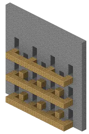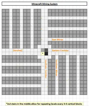 This form of mining involves someone to make a hall way and then make a small opening in the wall. From there, one must simply dig out a portion of the block to create a space. This method is repeated many times down the hall on either side to create rooms for various purposes, while finding several ores and valued materials in the process. This method is useful for the creation of houses, barns, indoor-gardens, storages, and in the creation of hard-to-find/secret places as it offers a variety of places one may go to in order to find something, but they may likely give up in the process unless they are determined.