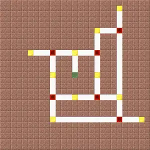 Each connection is a hub formed by two of the cardinal branches intersecting, meaning if players went to the first north hub down, they would have to mine one push or hub to the left and connect to it from the first west hub down by pushing right. It's the same as the hub but it leaves two walls with nothing to do, if the player try to continue with them, they will get intersections that are hard to make aesthetic unless the player are looking for a large open mine, or a maze mine. Instead, the player can use it for chests, and it works well for its purpose. Very hard to describe with letters, so here's a picture instead: Picture