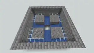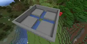 If there is not enough space for larger designs, this might be used. Its small size of 10×10 or 20×20 (inner area) makes it able to be incorporated into larger construction projects without trouble. It uses four water source blocks, one in each corner, with the water flowing around 3×3 squares of building material to the central hole. The parts of the water between the wall and the blocks is closed over to provide more spawning area.