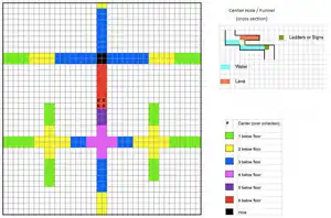 An easily-built design can be made in a 20×20 area, using eight water source blocks to fill the channels, which are exactly eight blocks long so that the water stops exactly at the edges of the central hole. The design can be easily stacked or placed next to each other to increase the effectiveness. This design can be made even smaller as shown in the video (14×14 area). Shrinking the design can be done by using signs to cut off the water flow at the edge of the sinkhole, forcing the mobs to fall into the central hole.